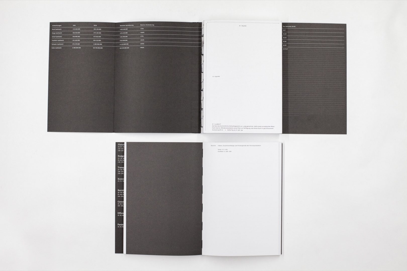 Diese Publikation ist als Versuch zu verstehen, die industrielle Tierhaltung und die daraus entstehenden Auswirkungen möglichst objektiv und dabei leicht verständlich darzustellen. Durch eine rationelle und reduzierte Gestaltung soll die Auseinandersetzung mit komplexen Themen aus den verschiedensten Bereichen der industriellen Landwirtschaft erleichtert werden. Im Vordergrund dieser Publikation stehen konkrete Zahlen und Fakten, die durch erläuterndes Textmaterial und visuell konsequente Grafiken nachvollziehbar werden – auf Bildmaterial wurde bewusst verzichtet, da die damit einhergehende persönliche Empfindung eine distanzierte Objektivität verhindern könnte. Die Betrachterin oder der Betrachter soll die Möglichkeit haben, sich dieser Materie unbefangen zu nähern.
